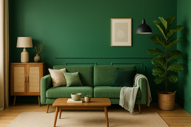 Le pareti verdi possono ampliare lo spazio se chiare, o renderlo più raccolto se scure. Verde pastello e salvia sono ideali per camere luminose, mentre muschio e pino funzionano in soggiorni ampi con molta luce naturale.